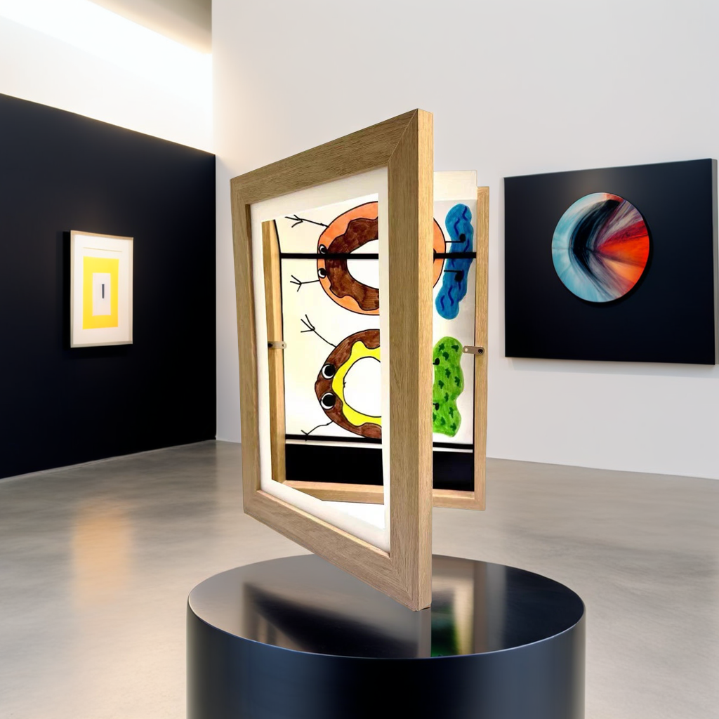 Behind the display, older drawings are stored safely inside. It’s like a time capsule of your child’s imagination.